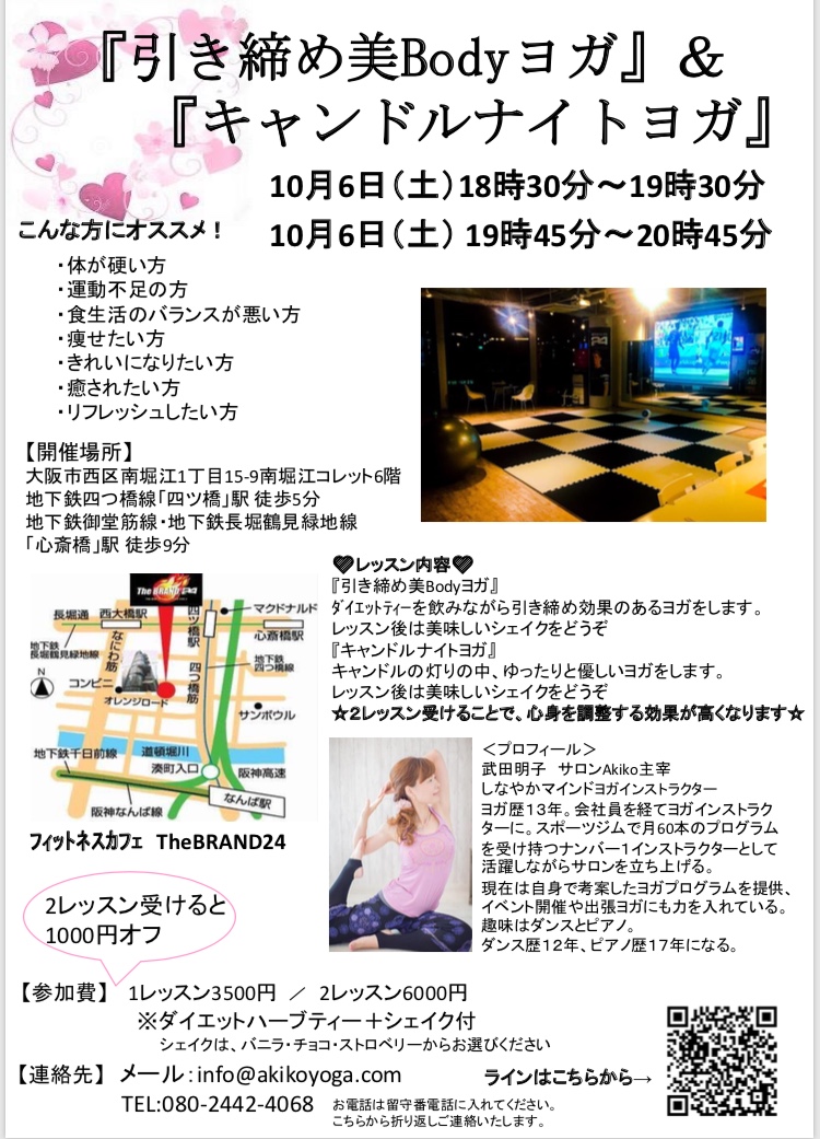 10/6(土)18時半~心斎橋にあるフィットネスカフェTheBRAND24で、