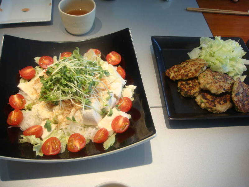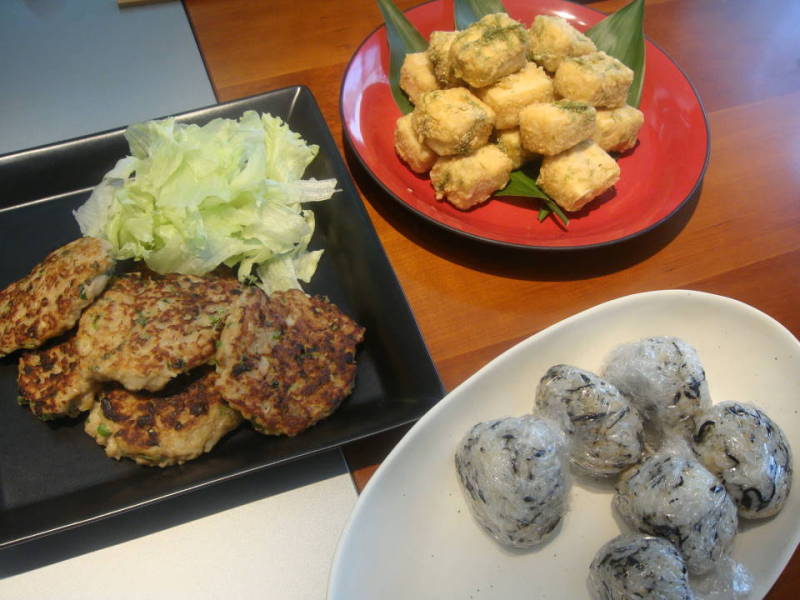 レンコンバーグ、高野豆腐のから揚げ、豆腐サラダ、