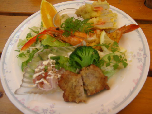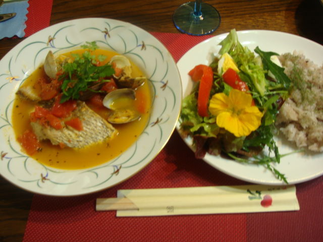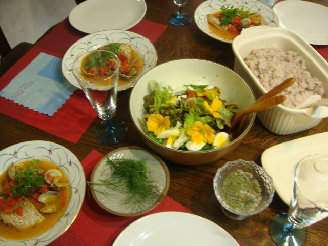 アクアパッツァ、ハーブのサラダ、ハイビスカスの御飯、